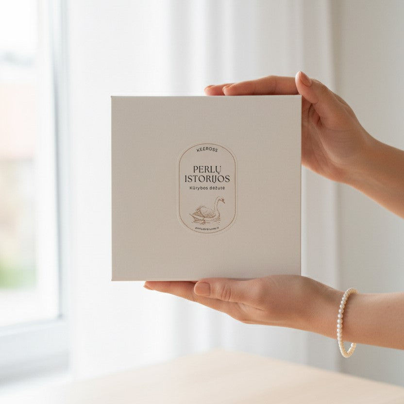 Kiekvienas papuošalas supakuojamas į dėžutę, kartu su atvirute, priežiūros kortele ir valymui skirta servetėle.